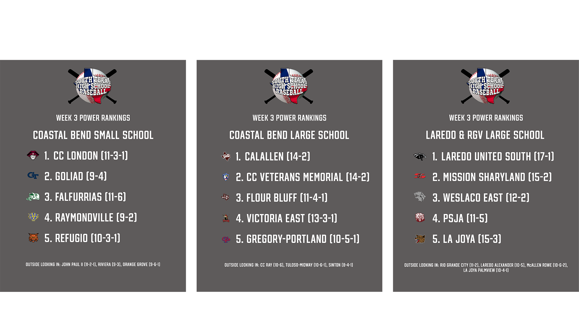 Lastly, the Alice Coyotes are also catching some attention. They swept the district opening series over CC Ray, and then went 2-3 in the Coastal Bend Invitational. If the Coyotes can find some consistency throughout the rest of the season, don't be surprised if they grab a playoff spot.WEEK 3 POWER RANKINGS
