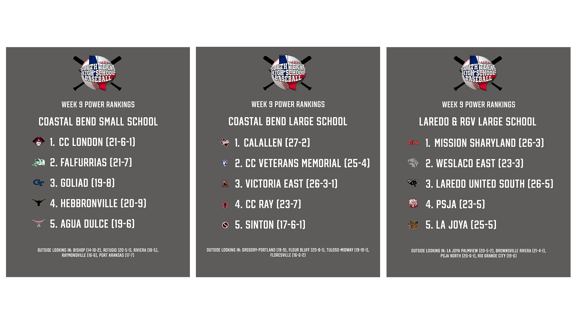 On Saturday, I watched Calallen take on London for a few innings before I had to leave early. London jumped on Coll Carroll (LHP) in the first inning and led 1-0 most of the game. However, in the final few innings, Calallen scratched for a run to tie it, then took the lead. They were able to hold on and get a 2-1 win, in a battle of the defending state champions. This was a great test for both teams, as they are both looking to repeat their success from last season.WEEK 9 POWER RANKINGS